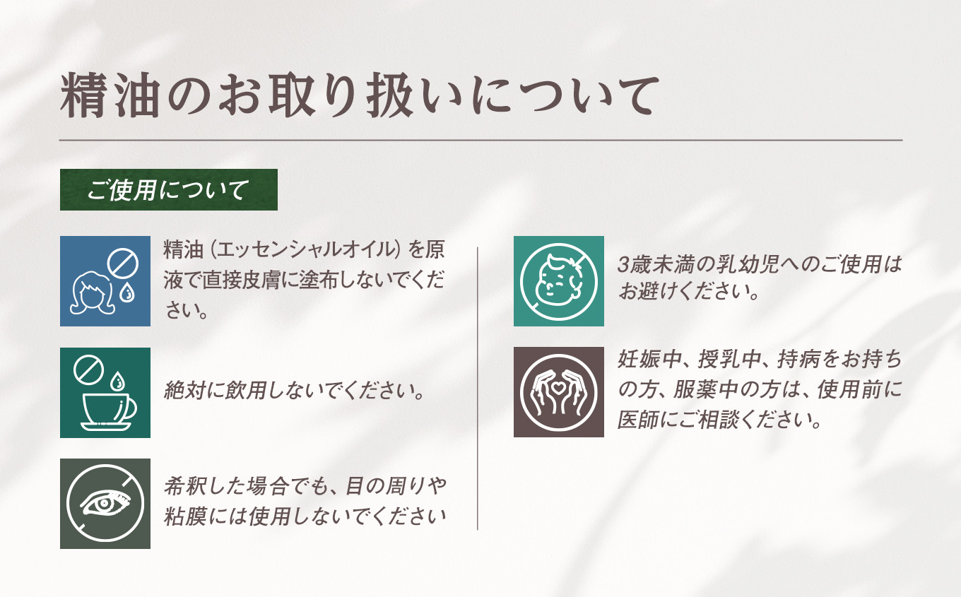 | 容量 | 精油(エッセンシャルオイル):クロモジ 1ml |