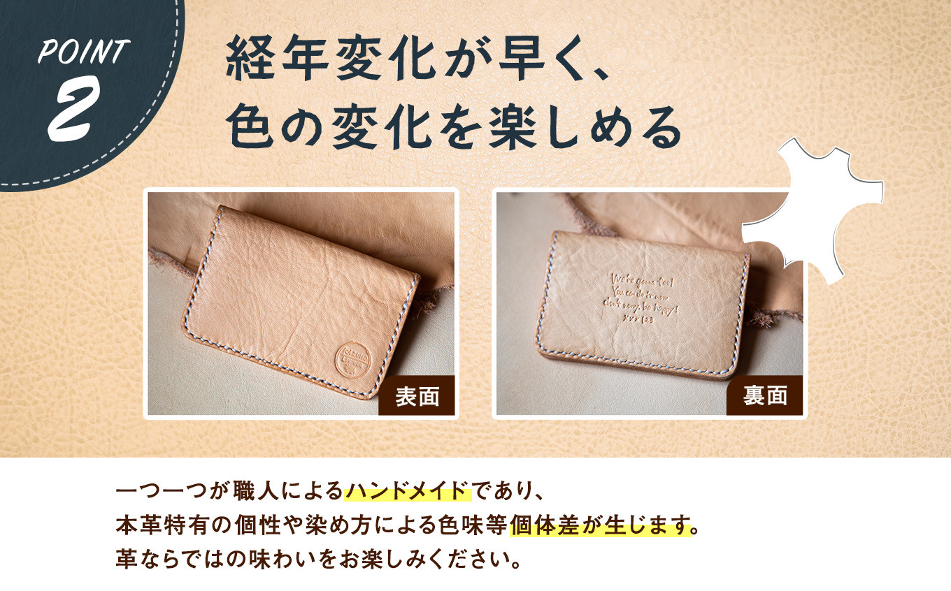 一つ一つが職人によるハンドメイドであり、本革特有の個性や染め方による色味等個体差が生じます。