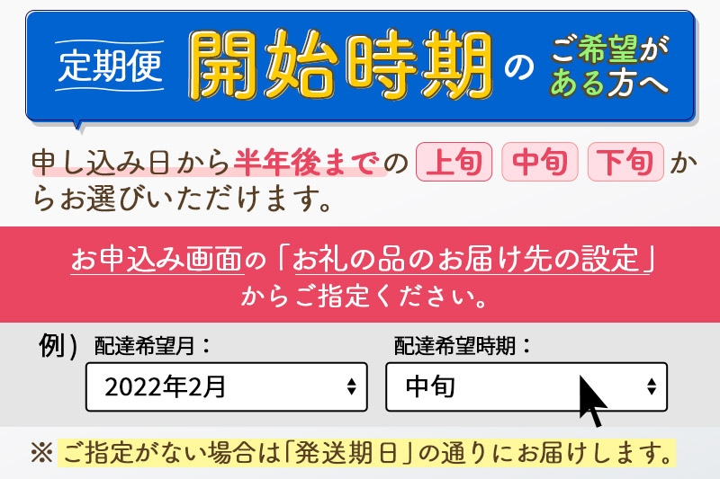 【定期便】全6回。 初回は発送時期は返礼品ページをご確認ください ※年末年始、長期休業や申込が殺到した際は、発送が遅れる場合がございます。 ※定期便期間中に運送会社が変更になる場合がございます。 ■定期便について ---- 初回は、ページ記載の配送時期通りに発送します。 2回目以降は、その翌月、同じ時期を目途に発送いたします。 例) 初回発送が10月上旬の場合 2回目の発送は11月上旬 3回目の発送は12月上旬 ■■*1*■■ お届け時期のご希望がある方へ お申込み日から6ヶ月後まででお届け開始時期をお選びいただけます。 ※2026年1月中旬以降のご指定から承れます。 ご希望の場合は、お申し込みの際に「申し込みに関する備考」にお届け希望開始時期を記載してください。 (例)4月上旬から希望など ※お申込状況によっては、お受けできない時期もございます。その場合は当窓口よりご連絡いたします。 ※ご希望がない場合は、1~2週間を目安に発送(休業日除く) ■■*2*■■ お届け周期の調整について 1ヶ月周期でのお届けのところ、6週間や隔月など、 ご希望に合わせて「最長2ヶ月まで」の間隔に調整することが可能でございます。 ご希望の場合はお申込の際に「申し込みに関する備考」へ希望周期を記載してください。 例)隔月で届けてほしい、1ヶ月半周期で届けてほしい、など ※ご希望がない場合は、1ヶ月周期にて発送します。 ■■*3*■■ お届け時期の延長サービスについて 定期便1回目をお受取後、最終回お届けまでの間で「合計6ヶ月」お届け時期の延長が可能でございます。 --- 備考欄に記載ができなかった、お申込内容の変更をしたいなど、 ご不明点やご要望がある場合は、下記項目をご記載の上、 メール( furusato-yurihonjoshi-akita@willdriven.co.jp)、またはお電話(050-5527-6934)にてご連絡ください。 ・寄附者様姓名 ・お申込サイト名 ・申込番号 ・お問い合わせ内容 --- |