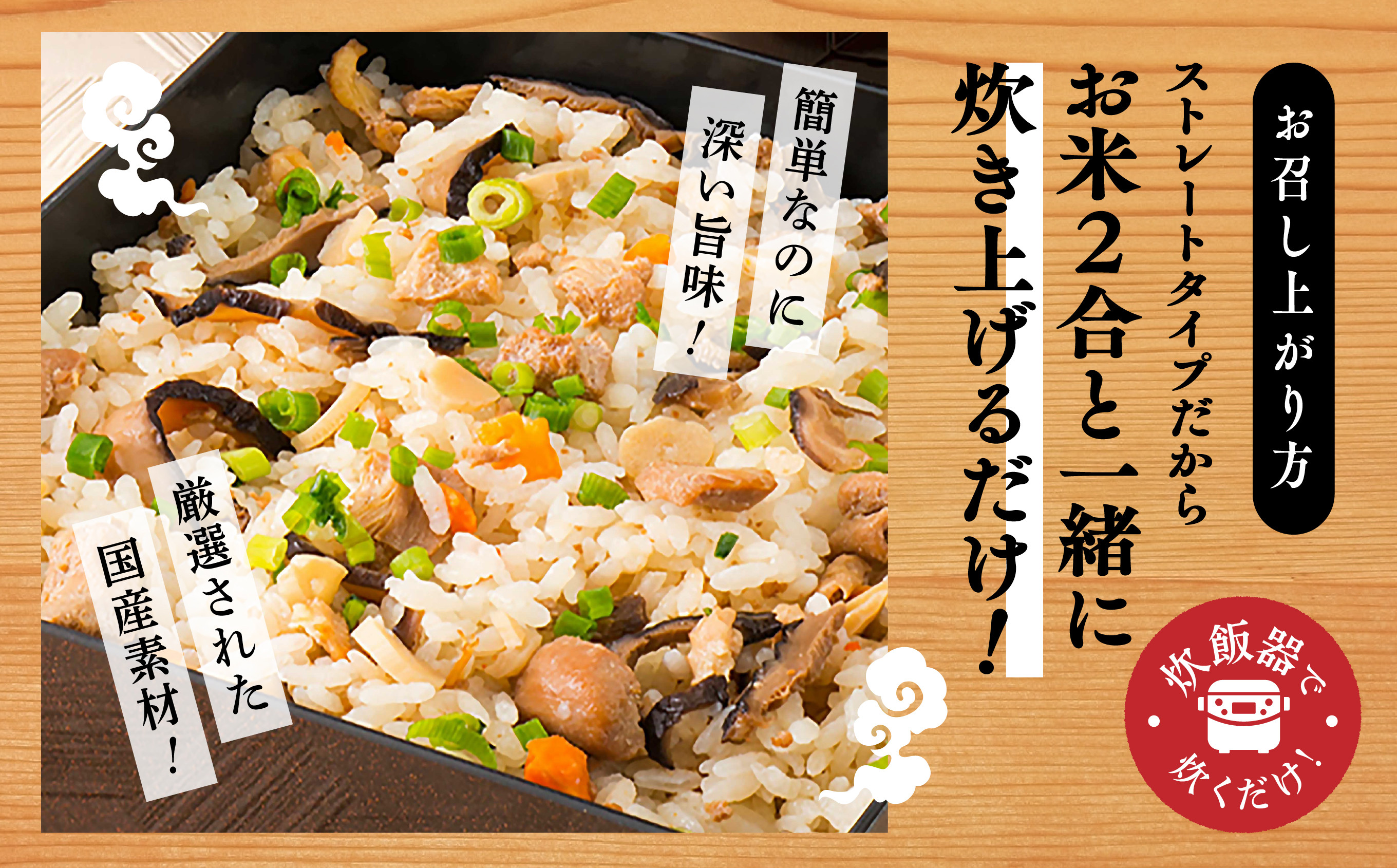 2合の研いだお米に具とスープを入れて炊飯器で炊くだけ。簡単調理で出来るこだわり「炊き込みご飯の素」です。