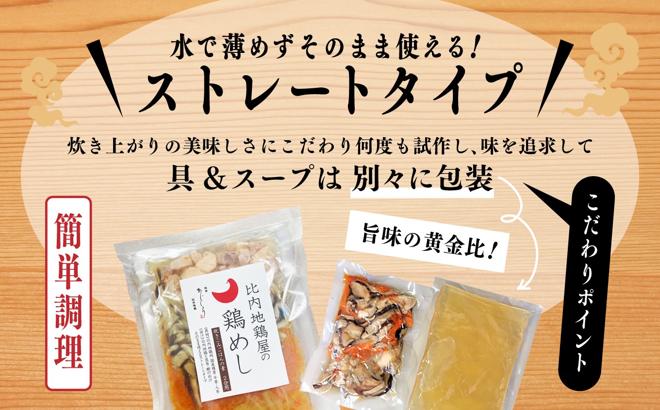 比内地鶏の鶏ガラから作る清湯スープに、昆布・鰹・舞茸などの旨みを加えた出汁と、歯応えのある比内地鶏肉と国産の野菜のみを使った具。1袋2合用で洗米に加えて炊くだけで本格的な鶏めしが作れます。