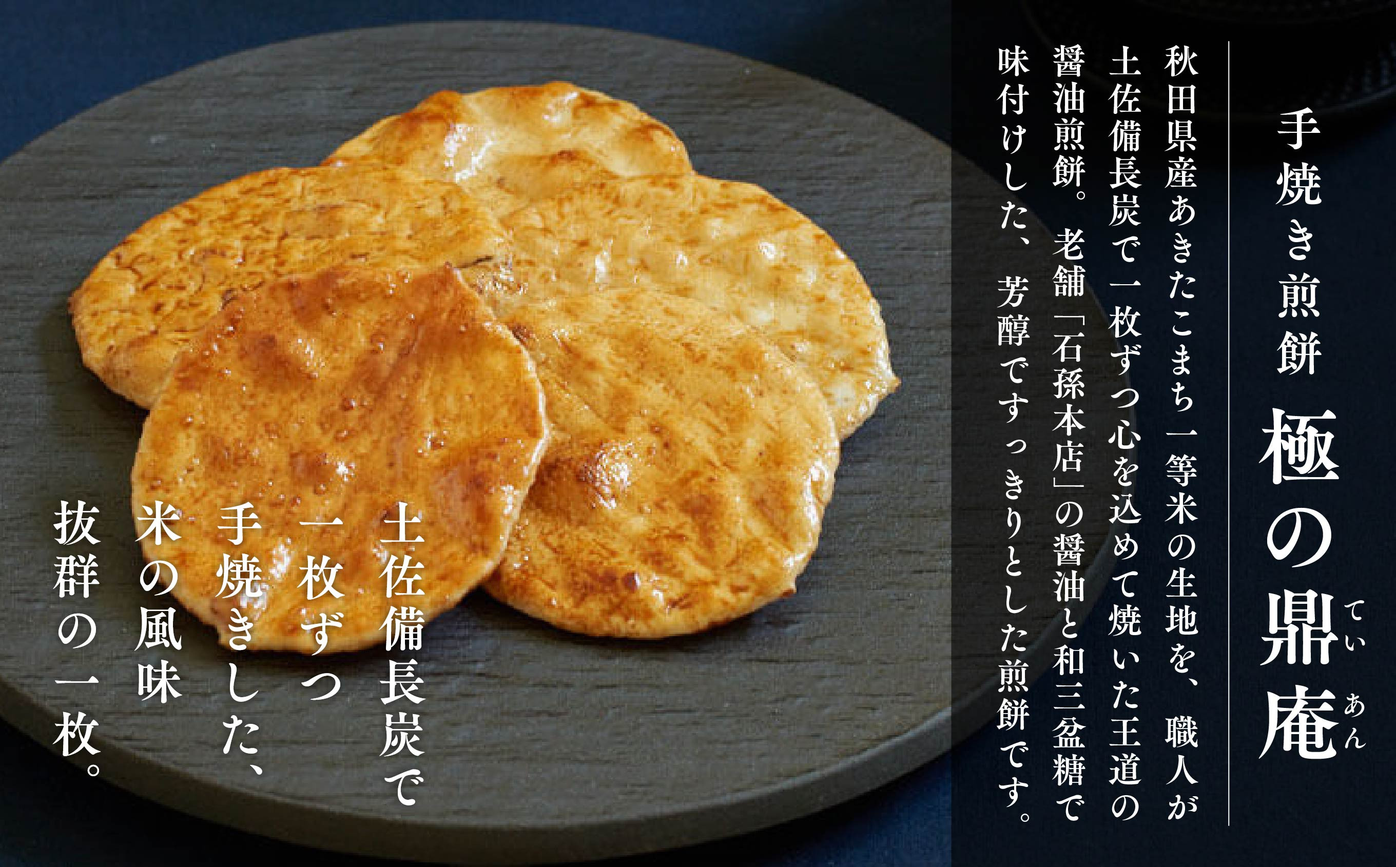 あきたこまち100%使用。和三盆糖を独自配合した秘伝醤油だれで味付けをしました。 金の鼎庵・極の鼎庵 30枚入 詰合せ 各15枚 × 2種 手焼き せんべい 煎餅 おせんべい 米菓 詰め合わせ あきたこまち 厳選 一等米 秘伝だれ 石孫本店 醬油 和三盆糖 個包装 訳あり お菓子 うるち米 お茶請け お煎餅 醤油せんべい 手土産 常温 日持ち お取り寄せ 秋田 潟上市 鼎庵【鼎家】