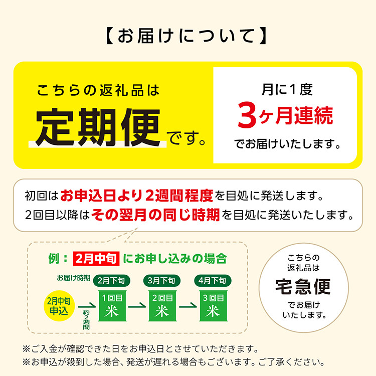 《通常配送》初回は、お申込日より2週間程度を目処に順次発送いたします。 《新米先行予約》10月以降順次発送 2回目以降は、その翌月の同じ時期を目安に発送いたします。 ※毎年10月に新米への切替を予定しておりますが、天候や作柄によって前後する場合がございます。予めご了承ください。 ※こちらの返礼品は【沖縄県・離島エリア】へお届けできない品です。 |