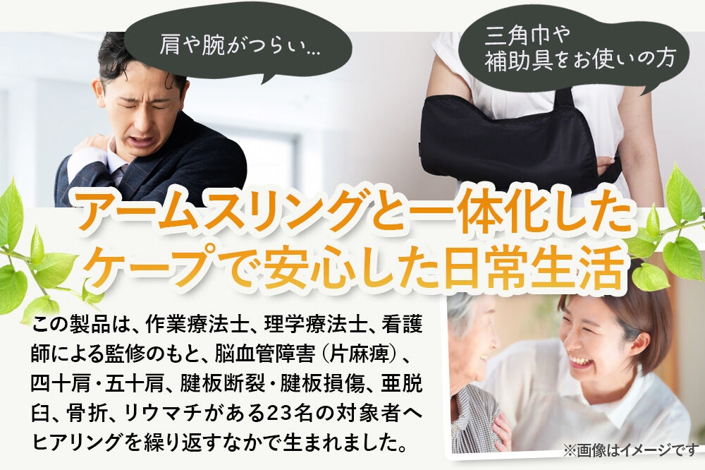 ・肩や腕がつらい、だるい方、三角巾やアームスリング(アームホルダー)といった補助具をお使いの方。腕の固定にゆったりとしたゆとりが求められるリハビリ期の方。