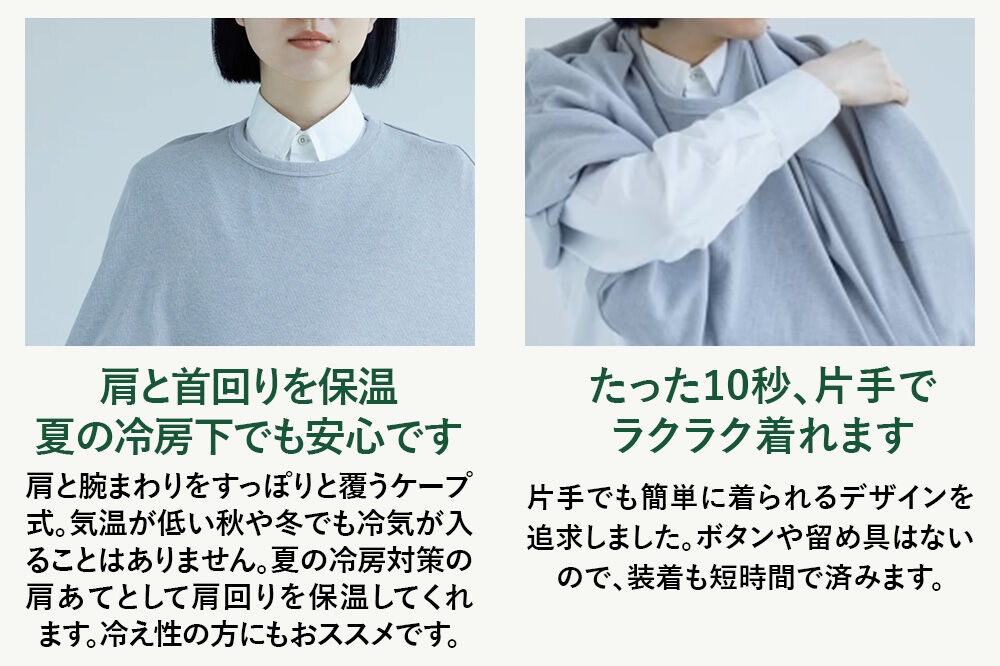 肩と腕まわりをすっぽりと覆うケープ式。気温が低い秋や冬でも冷気が入ることはありません。夏の冷房対策として肩回りを保温してくれます。冷え性の方にもおススメです。