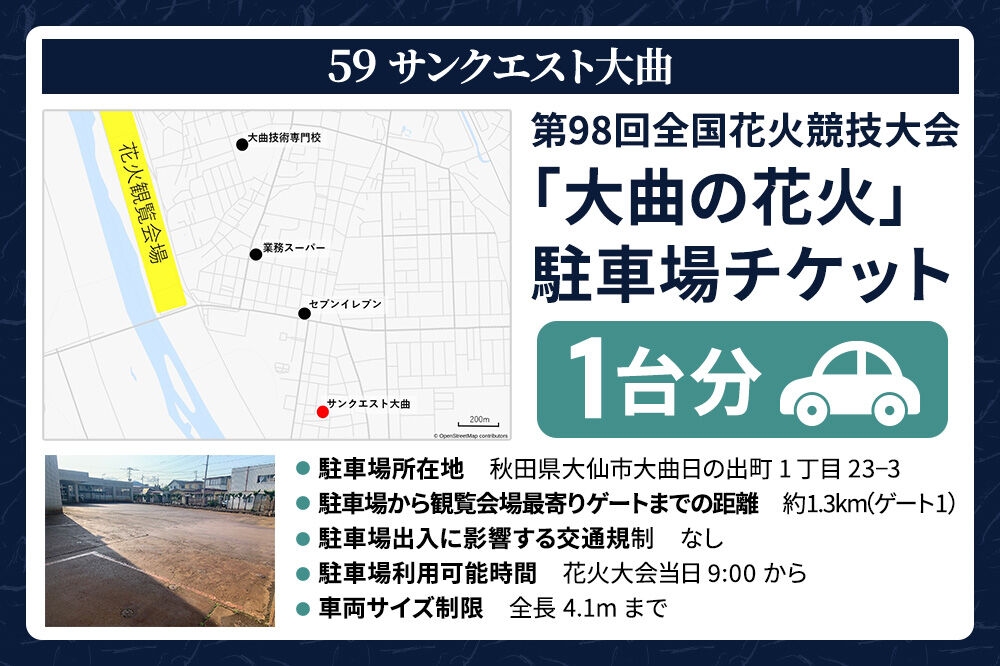 | 容量 | ■名称:駐車場チケット ■内容量:1台分(59 サンクエスト大曲) ■駐車場概要:■駐車場所在地:秋田県大仙市大曲日の出町1丁目23-3 ■駐車場から観覧会場最寄りゲートまでの距離:約1.3km(ゲート1) ■駐車場出入に影響する交通規制:なし ■駐車場利用可能時間:花火大会当日9:00から ■車両サイズ制限:全長4.1mまで ■注意事項: ・本返礼品に観覧席および宿泊先の手配は含まれていません。 ・車両サイズ制限を超える大きさの車はご遠慮ください。1台で複数区画を利用することはできません。 ・テント設営及び火気の使用はできません。 ・対象の花火大会が延期となった場合は、延期された日の駐車場チケットとして扱われます。 ・対象の花火大会が中止となった場合は、サイト内大仙市返礼品より代替品をお選びいただくことになります。 ・寄附後のキャンセルはできませんので、不明点がある場合は必ず寄附を行う前にお問い合わせください。 ※ふるさと納税(寄附申込み)のキャンセル、返礼品の変更・返品はお受けできません。あらかじめご了承ください。 ■提供元:「大曲の花火」実行委員会安全部会 |