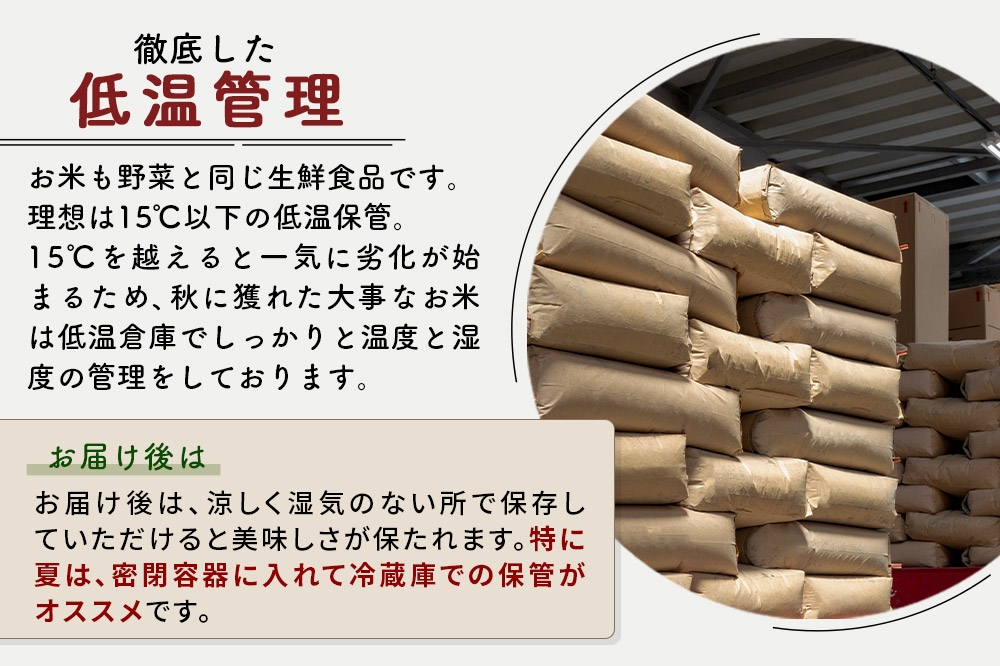 新米の味そのままを大切にした、いつまでも旬の「低温貯蔵」です。