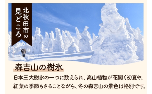 北秋田市は秋田県の北部中央に位置し、「大館能代空港」の所在地として東京から約70分とアクセスも良好です。面積は1152.76㎢(東京23区の合計面積の約2倍)あり、秋田県の中でも2番目の広さを誇ります。その多くは豊かな自然に囲まれ、四季の移り変わりに合わせ、様々な表情を見せてくれます。「花の百名山」に数えられる『森吉山』では、多種多様な高山植物はもちろん、冬のダイナミックな樹氷は日本三大樹氷観賞地のひとつとしても知られています。