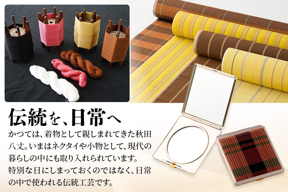 200年以上の歴史を誇る秋田県指定無形文化財であった秋田八丈は、ハマナスの茶、カリヤス、レンゲツツジの赤味の黄などを組み合わせた伝承草木染で、渋みのある独特の黄色や鳶色や黒色による縞・格子柄のさらさらとした手触りが特徴な格調高い絹織物です。 国産絹100%なので、手触りの良さを体感してください。