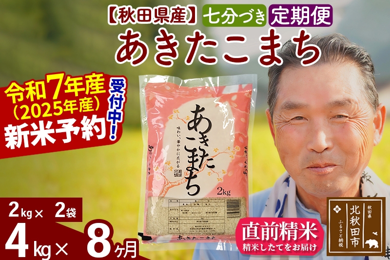 株式会社おおもり 令和7年産《定期便8ヶ月》秋田県産 あきたこまち 4kg【7分づき】(2kg小分け袋) 2025年産 お届け時期選べる お届け周期調整可能 隔月に調整OK お米 おおもり [おおもり 秋田 お米 あきたこまち 米どころ 東北 北秋田市 定期便 毎月お届け]
