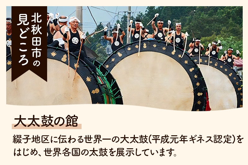 その他、世界一の綴子大太鼓や世界遺産に登録された伊勢堂岱遺跡、田舎スイーツ「北あきたバター餅」などがあり、文化・食・自然など、様々な楽しみ方ができるまちです。