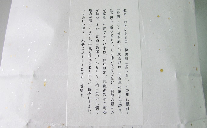 数多くの神が宿る里、秋田県「釜ヶ台(かまがたい)」。この里に根付く「番楽」という神を祀る伝統芸能は、四百年の歴史を誇り、郷を照らし導いてきました。その神の恩恵を受け、自然の豊かさを享受して栽培されたお米は、無病息災、悪疫退散のご利益を持つとされています。ハレの日を祝う、大事なひとときにぜひご賞味を。