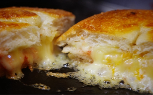 とろけるチーズを挟んだベーグルのホットサンドも当店人気商品の一つ。