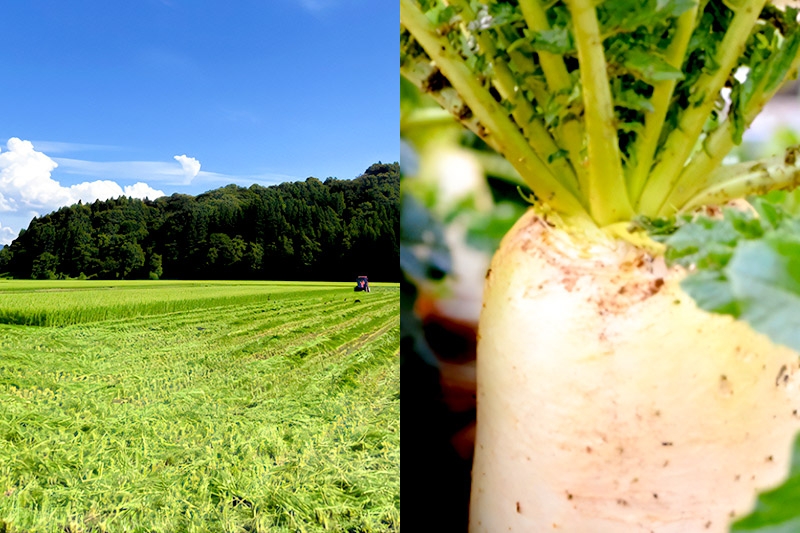 そんな自然の恵みに育まれた豊かな畑で栽培する、甘味度の高い白首大根を、大切ないぶりがっこの原料に用いています。