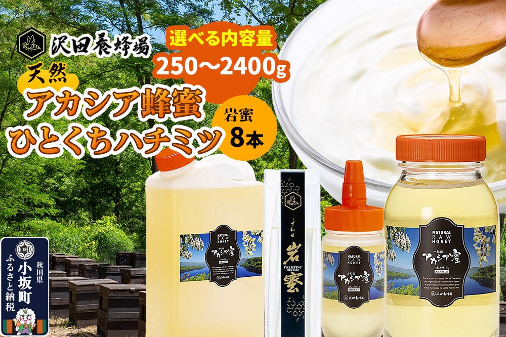 日本最大級アカシア群生地「小坂町」 はちみつ 天然十和田 アカシア蜂蜜 【選べる内容量 250g/500g/1200g ビン・ポリ缶/2400g ビン・ポリ缶】 +TASTING HONEY ひとくちはちみつ 岩蜜 8本セット [国産 蜂蜜 はちみつ ハチミツ アカシア 岩蜜 食べ比べ セット 朝食 沢田養蜂場]