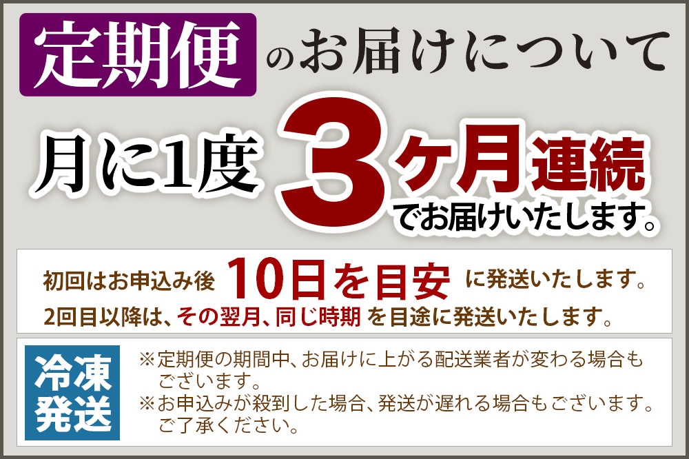 【定期便】全3回。 初回は10日を目安に発送(休業日除く) ※定期便期間中に運送会社が変更になる場合がございます。 ■定期便について ---- 初回は、ページ記載の配送時期通りに発送します。 2回目以降は、その翌月、同じ時期を目途に発送いたします。 例) 初回発送が10月上旬の場合 2回目の発送は11月上旬 3回目の発送は12月上旬 |