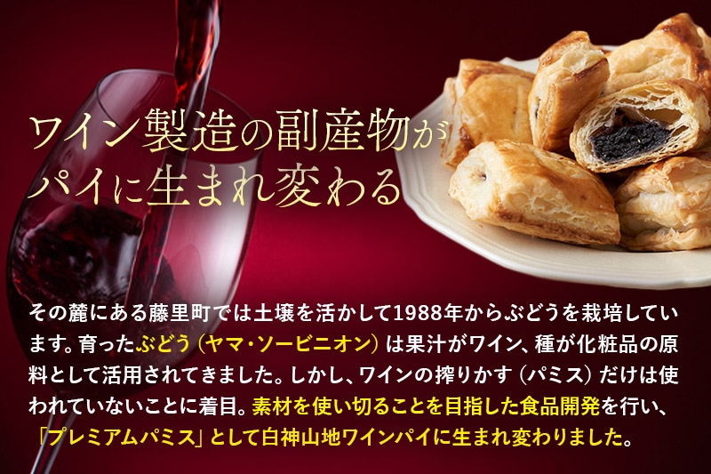 しかし、ワインの搾りかす(パミス)だけは使われておらず、今回素材を使い切ることを目指した開発を行い「プレミアムパミス」としてパイに生まれ変わりました。