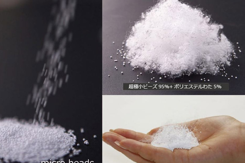 1.腰枕の中素材は、パウダー状の超極小ビーズ素材とふわふわ綿の混合ミックス。この絶妙なバランスが独特のふんわり柔らか感を実現しました。この極小ビーズは流動性が高いので、体の形に合わせて自在に枕の形状が変化してくれます。寝返りをうったときも、体の動きに合わせて形を変えるので、スムーズに寝姿勢を変えることができます。