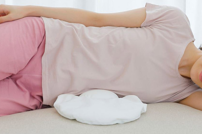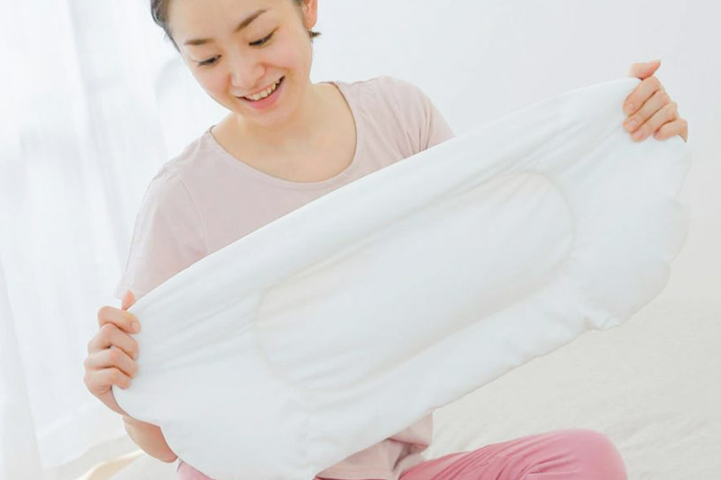 2.中央部は、中素材が流動しすぎないよう固さを保ち、腰と敷き寝具との間にできた隙間埋め、腰をしっかりと支えてくれます。また、丸みのある形にすることで、段差を軽減して腰枕使用中も寝返りを妨げないようにしました。サイドは中素材が流動しやすい形状にし、寝返りをうって横向き寝になった際、ウエスト部分の形に合わせて中素材が動き、体を優しく支えてくれます。