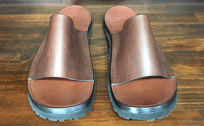 当社ロゴ入りのレザーサンダルです。裁断、床面処理、縫製(手縫い)まで、1つ1つ妥協せず丁寧に手作りしています。使い込むほど、なじんできますので、自分だけの風合いを楽しめます。牛革使用で使うほどに味が出ます。