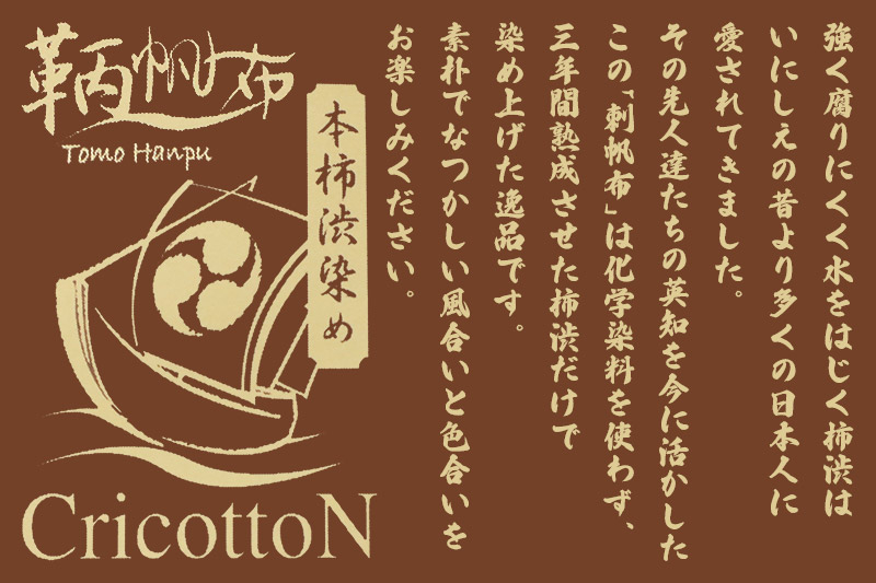 鞆帆布の素材は、独自の方法にて柿渋を繰り返し染め付けることを行い、より良い風合い、色合いを表現しております。