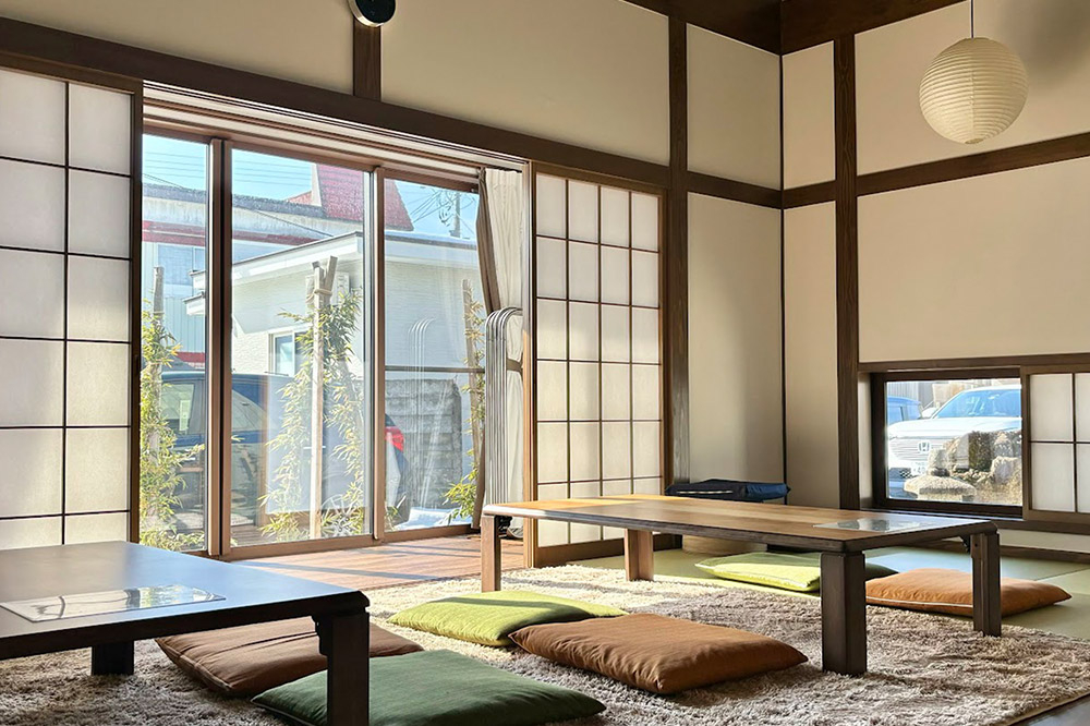 ミロクハウスは、この、美郷町の「ミ」と六郷の「ロク」を組み合わせた名称で、古民家風の佇まいながら、断熱性や防音性にもしっかりと配慮したゲストハウスです。宿泊される皆さまが最大限にリラックスできるよう、風の流れや気の流れを考慮した風水建築で設計され、2023年5月に新築開業しました。リビングの天井は高く、古木の梁があしらわれているため、居心地が良く、家族や仲間との団らんに夢中になり、ついつい時間を忘れてしまいます。
