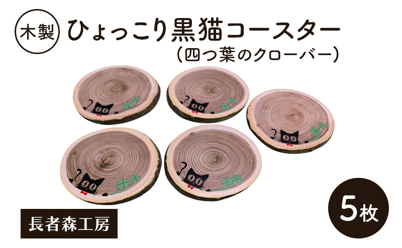 木製 ひょっこり黒猫コースター(四つ葉のクローバー) 5枚[長者森工房]福猫コースター 秋田県 羽後町【コースター 木製コースター 猫 黒猫 猫雑貨 雑貨 おしゃれ 和風 縁起物】