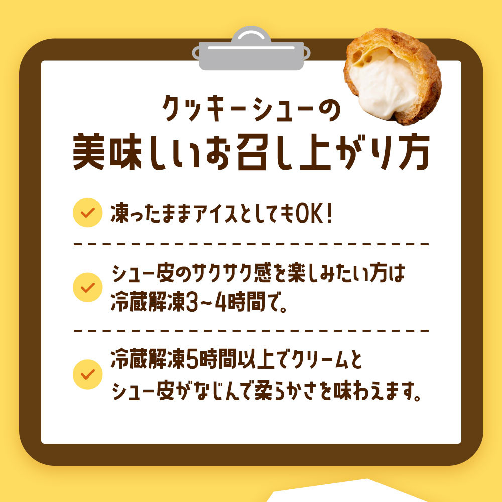 〇冷蔵解凍5時間以上でクリームとシュー皮がなじんで柔らかさを味わえます。