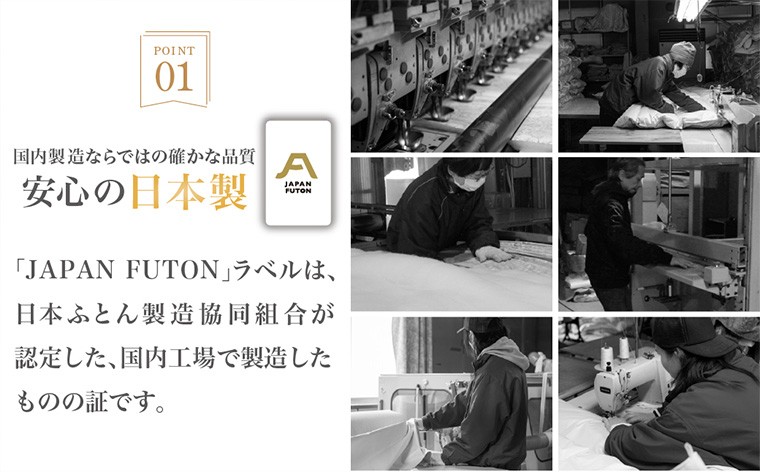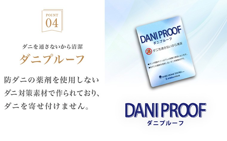 また、側生地は、花粉が付きにくい花粉フリー(防汚加工)、ダニを通しにくいダニプルーフ加工、繊維を清潔に保つSEK加工、天然バージンオリーブオイルの柔軟加工を施しています。