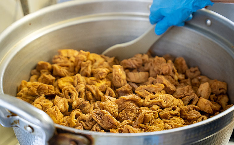山形市内において原材料の仕入れから計量、蒸し、焼成、カット、乾燥(焼麸)、揚げ方、煮方(揚げ麸)、包装まで行っている山形市の地場産品です。