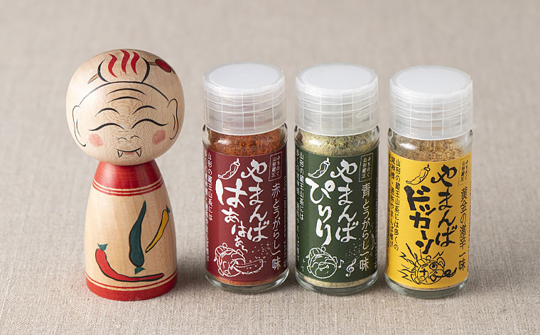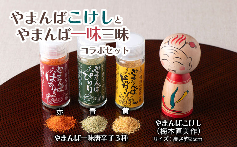 | 容量 | やまんばこけし 1体(工人:梅木直美作) [高さ:約9.5cm/横(最大頭部分)約4.5cm/重量:約50g] やまんば一味唐辛子 3種(赤・青・黄)各13g 【賞味期限:365日】 |