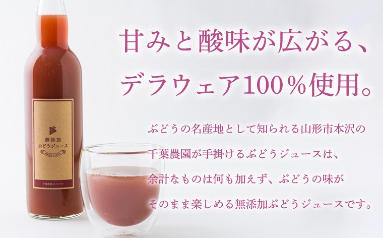 ぶどうの名産地として知られる山形市本沢の千葉農園が手掛けるぶどうジュースは、余計なものは何も加えず、ぶどうの味がそのまま楽しめる無添加ぶどうジュースです。