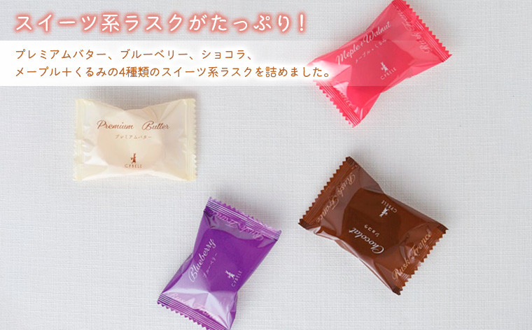 プレミアムバター、ブルーベリー、ショコラ、メープル+くるみの4種類のスイーツ系ラスクのお得パック。