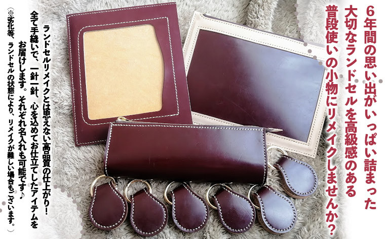 思い出一杯の大切なランドセルを、実用的なポーチ(通帳、母子手帳入れ)と、キーホルダーにお仕立て致します。 当工房のランドセルリメイクは、内装等に選び抜いたサドルレザー(牛革)を使用しておりますので、ランドセルリメイクにありがちな安っぽさは一切ありません。 また、ミシンを使わず、全て手縫いにてお仕立てしております。 お時間は頂戴致しますが、一針一針、心を込めてお仕立てしたアイテムをお届け致します。 ★注意事項★お申込み前に必ずご確認ください! 【劣化等、ランドセルの状態により、リメイクが難しい場合がございます】 ・ランドセルにひび割れがある ・ランドセルにべたつきがある ・ランドセル生地がボロボロと崩れる ・曲げた部分がひび割れる 上記の様な状態のランドセルは、リメイク出来ない場合や、特殊な加工(サドルレザーでの囲み加工など)を施してリメイクしなければならなくなります。 囲み加工でのリメイクの場合は、一部にランドセル生地を使用し、他の部分はサドルレザーでのお仕立てとなります。 ふるさと納税の仕組みとして、お申込みいただいてからのキャンセルは出来ません。 お申込みいただいた後にランドセルの状態が悪く、仮にリメイク出来ない場合でも、キャンセル、返金などは承れません。 そのため、その様なトラブルが発生しない様、事前にランドセルの状態をご確認いただき、お申込みいただければと思います。 ランドセル生地に問題なく、そのままリメイク出来る場合は、そのままお仕立て致します。 また、仮に囲み加工でのお仕立ても難しい場合には、ランドセル生地は使えませんので、全てサドルレザーでのお仕立てとなります。 ランドセルリメイクではなくなってしまいますが、キャンセルが出来ないふるさと納税のシステムのため、ご了承ください。 以上のことをご了承いただき、ランドセルの状態を確認いただいてから、お申込みいただきます様、お願い申し上げます。 ◎どの様なアイテムが出来るかなど、ランドセルリメイクの詳細につきましては、お申込前に”kiwami leather”ホームページにてご確認くださいませ。 山形市内の工房において全ての製造工程(裁断・磨き・組み上げ・縫製など)を行っている山形市の地場産品です。 事業者:kiwami leather