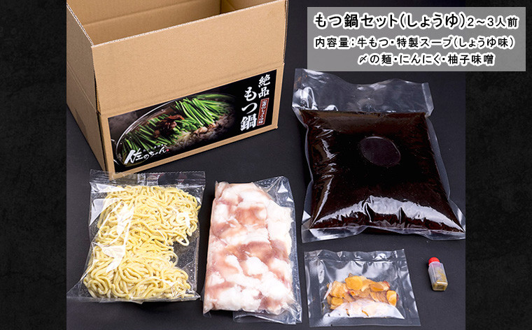 | 容量 | 1)もつ鍋セット 2~3人前(しょうゆ) 内容量:牛もつ・特製スープ(しょうゆ味)・〆の麺・にんにく・柚子味噌 ※クール便で冷凍した状態で発送いたします。 【賞味期限:6ヶ月(解凍後2日)】 2)もつ鍋セット 2~3人前(味噌) 内容量:牛もつ・特製スープ(味噌味)・〆の麺・にんにく・柚子味噌 ※クール便で冷凍した状態で発送いたします。 【賞味期限:6ヶ月(解凍後2日)】 ※もつ鍋の味をお選びください |