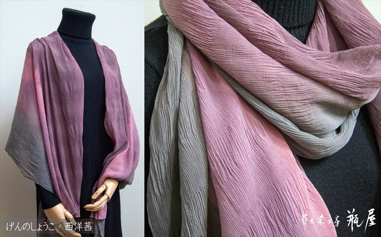 素材は山形県鶴岡市の「松ヶ岡シルク」を使用し、生地の両端は手絎け処理しています。古くから薬草としても利用されてきた「ゲンノショウコ」ツル性の多年草の西洋茜の根を使い、グレーや桃色や小豆色に染め上げました。
