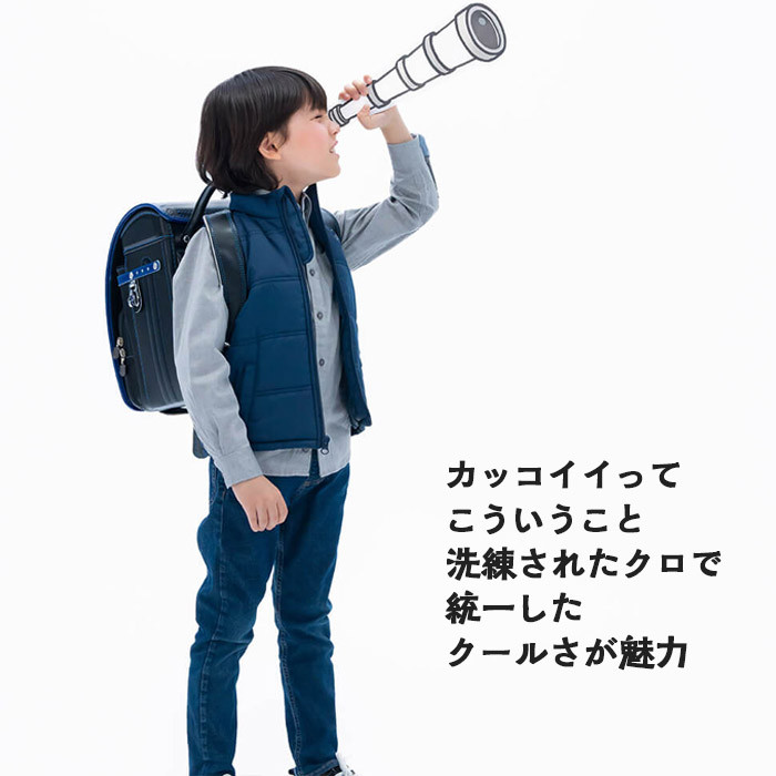 カッコイイを追求して完成したオールブラックのランドセル。ステッチやヘリで遊び心や個性を演出できるのもかっこいい「ブラックキャップス」シリーズ。