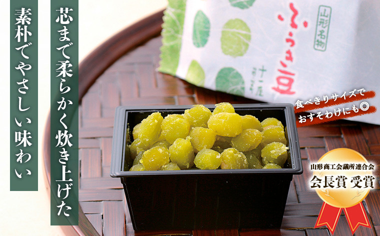 山形市内の工場において原材料の仕入れから、豆の炊き上げ、味付け、梱包まで行っている山形市の地場産品です。