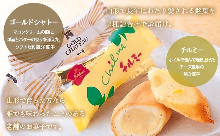 祝・販売開始50年!山形で長年にわたり愛される銘菓! マロンクリームの餡に、洋酒とバターの香りを添えた、ソフトな和風洋菓子シャトー。 ホイルで包んで焼き上げたチーズ風味のチルミー。 山形で育った方なら誰でも味わったことのある老舗のお菓子です。 山形市内の工場において原材料の仕入れから、生地づくり、焼き上げ、梱包まで行っている山形市の地場産品です。 事業者:株式会社十一屋 ◆必ずお読みください◆ ◎お受け取り後は必ずすぐに開封し、中身の確認をお願い致します。 ◎「お申込みの不備」「事前連絡をいただいていない長期不在や転居」「住所不明」「日数がたってからのお受け取り」に対する再出荷は致しかねますのでご了承下さい。 ※お礼の品の配送日の指定は承っておりません。 ※お申し込み状況によりお届けが遅れる場合がございます。 ※画像はイメージです。画像のものと多少異なる場合があります。 ※お礼の品お受取り後、すぐに状態をご確認ください。お礼の品の発送には万全を期しておりますが、万が一不良等があった場合は、写真・画像を添付の上お早めに「山形市ふるさと納税お礼の品事務局」までご連絡ください。尚、お時間が過ぎてからの対応は致しかねます。