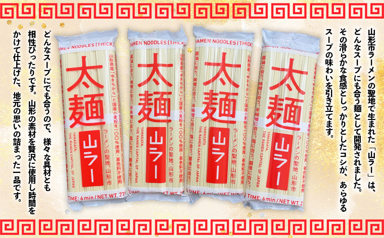 山形県産の「ゆきちから」小麦と国産小麦を100%使用した山形市が誇る乾麺「山ラー」が登場しました。 着色料は一切不使用で、そのままの自然な風味と食感を楽しむことができます。 山形市ラーメンの聖地で生まれた「山ラー」は、どんなスープにも合う麺として開発されました。 その滑らかな食感としっかりとしたコシが、あらゆるスープの味わいを引き立てます。どんなスープにでも合うので、様々な具材とも相性ぴったりです。 「山ラー」を食べると、山形の美味しさがたっぷりと詰まった一杯に出会えます。 山形の素材を贅沢に使用し時間をかけて仕上げた、地元の思いの詰まった一品です。 山形市内の工場において、原料の仕入れから、ミキシング、圧延、切り出し、乾燥、裁断、包装まで行っている山形市の地場産品です。 事業者:合資会社酒井製麺所 ◆必ずお読みください◆ ◎お受取り後は必ずすぐに開封し、中身のご確認をお願い致します。 ◎「お申し込みの不備」「事前連絡をいただいていない長期不在や転居」「住所不明」「日数が経ってからのお受取り」に対する再出荷は致しかねますのでご了承ください。 ※お礼の品の配送日の指定は承っておりません。 ※画像はイメージです。画像のものと多少異なる場合があります。 ※お礼の品の発送には万全を期しておりますが、万が一不良等があった場合は、写真・画像を添付の上お早めに「山形市ふるさと納税お礼の品事務局」までご連絡ください。尚、お時間が過ぎてからの対応は致しかねます。