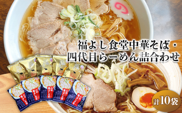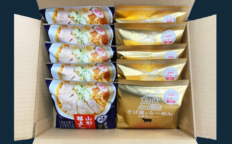 かつて山形県高畠町に店を構えていた「福よし食堂」は、行列が出来る地元の人気店でした。 長らくこの店で修業した店主が、現在は山形市内に「麺屋福よし」として店をオープンさせています。 もちもちあっさりの中華麺と、澄み切った醤油スープは、本店の味を変わらず引継ぎ、連日行列ができています。 そんな人気のラーメンをご家庭で再現できるよう商品化したのが「山形福よし食堂中華そば」です。 四代目そば屋のらーめんは、山形市内で昔から食べられてきた、あっさり牛ガラスープと、蕎麦屋仕立ての中華そばを再現した当社の代表こだわりの商品です。 2種の自慢の中華そばを5人前ずつの詰合せでご用意しました。日々進化し続けるラーメン業界の中にありながら、変わらぬ味で人々を魅了する昔ながらの中華そばです。 山形市において包装デザイン、袋詰め、箱詰め、卸売まで行っている山形市の地場産品です。 事業者:合資会社酒井製麺所 ◆必ずお読みください◆ ◎お受取り後は必ずすぐに開封し、中身のご確認をお願い致します。 ◎「お申し込みの不備」「事前連絡をいただいていない長期不在や転居」「住所不明」「日数が経ってからのお受取り」に対する再出荷は致しかねますのでご了承ください。 ※お礼の品の配送日の指定は承っておりません。 ※画像はイメージです。画像のものと多少異なる場合があります。 ※お礼の品の発送には万全を期しておりますが、万が一不良等があった場合は、写真・画像を添付の上お早めに「山形市ふるさと納税お礼の品事務局」までご連絡ください。尚、お時間が過ぎてからの対応は致しかねます。