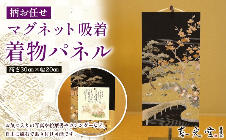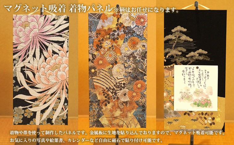 柄お任せ マグネット吸着 着物パネル 着物や帯を使って制作したパネルです。 金属板に生地を貼り込んでおりますので、マグネット吸着可能です。 お気に入りの写真や絵葉書、カレンダーなど自由に磁石で貼り付け可能です。 山形市内の作業場において、裏打ち、裁断、張り込み、熱プレス、梱包まで行っている山形市の地場産品です。 事業者:秋葉春光堂 ◆必ずお読みください◆ ◎お受取り後は必ずすぐに開封し、中身のご確認をお願い致します。 ◎「お申し込みの不備」「事前連絡をいただいていない長期不在や転居」「住所不明」「日数が経ってからのお受取り」に対する再出荷は致しかねますのでご了承ください。 ※お礼品の配送日の指定は承っておりません。 ※画像はイメージです。画像のものと多少異なる場合があります。 ※お礼の品の発送には万全を期しておりますが、万が一不良等があった場合は、写真・画像を添付の上お早めに「山形市ふるさと納税お礼の品事務局」までご連絡ください。尚、お時間が過ぎてからの対応は致しかねます。