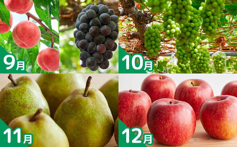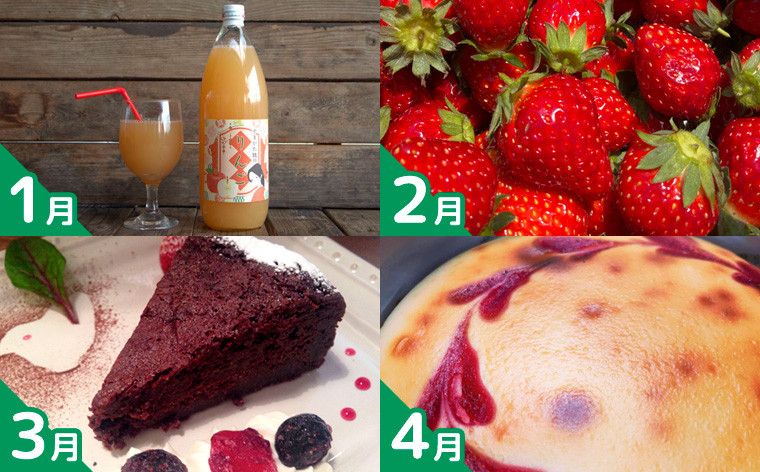 | 容量 | ☆ご入金確認後、翌月以降に記載の商品から全12回お届けいたします☆ ※配送開始月の指定は出来かねます。 【1月】 自家製りんごのりんごジュース 1000ml×4本 (1/15~2/15) 常温 【2月】 いちご【とちおとめ】 秀品 Lサイズ以上 250g~270g×4P (2/15~3/15) 冷蔵 【3月】 ガトーショコラ 5号サイズ(直径約15CM)×2ホール (3/15~4/15) 冷凍 【4月】 ラズベリーチーズケーキ 5号サイズ(直径約15CM)×2ホール (4/15~5/15) 冷凍 【5月】 1年熟成りんご酢 275ml×5本 (5/10~6/10) 常温 【6月】 さくらんぼ【佐藤錦】Lサイズ 約700g (6/10~7/5) 冷蔵 【7月】 青肉メロン【アンデスメロン】 秀品 2L~4L 約4.5kg(3~5玉) (7/5~8/5) 常温 【8月】 山形白桃【柔らかくなる桃】 秀品 約3kg(6~14玉) (8/5~9/5) 冷蔵 【9月】 山形白桃とピオーネのセット 秀品 約1.3kg(硬めの桃 約300~400g×2玉 )(ピオーネ 500~700g ×1房) (9/5~10/5) 冷蔵 【10月】 シャインマスカット 秀品 約1.2kg(500~700g ×2房) (9/25~10/25) 冷蔵 【11月】 山形ラ・フランス 秀品 約3kg(6~14玉) ( 11/1~12/1) 常温 【12月】 りんご【極めふじ】(無袋) 秀品 約3kg(6~14玉) (11/25~12/25) 常温 |