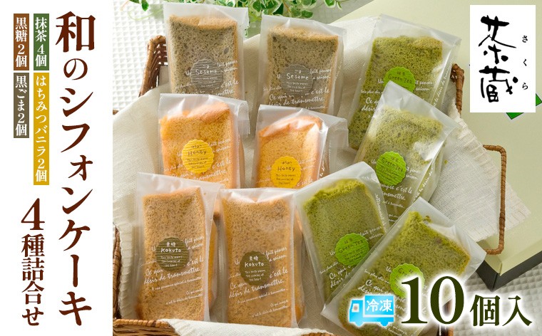 茶蔵 和のシフォンケーキ 4種詰合せ・10個入(抹茶4個・はちみつバニラ2 個・黒糖2個・黒ごま2個)サイズ:22×28×7cm 冷凍発送 FY25-281