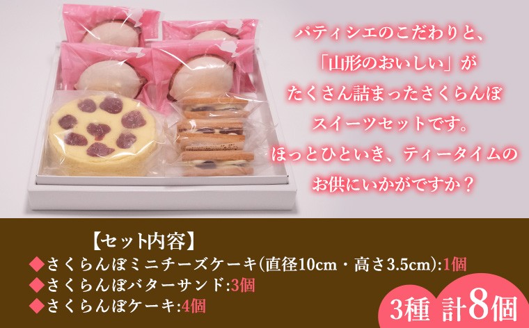 山形県産のさくらんぼを使用したスイーツセットです! さくらんぼの甘酸っぱさとチーズ本来の濃厚さを楽しめるチーズケーキ、洋香が香るザクザク食感のさくらんぼバターサンド、コロンとした形がかわいらしいさくらんぼの優しい風味香るさくらんぼケーキの3種詰め合わせです! 山形市内の店舗兼工場において、原材料の仕入れから、焼成、仕込み、仕上げ、梱包まで行っている山形市の地場産品です。 事業者:ビストロ・マーシー ◆必ずお読みください◆ ◎お受け取り後はすぐに中身をご確認ください。 ◎「お申し込みの不備」「事前連絡をいただいていない長期不在や転居」「住所不明」「日数が経ってからのお受取り」に対する再出荷は致しかねますのでご了承ください。 ※お礼の品の配送日の指定は承っておりません。 ※画像はイメージです。画像のものと多少異なる場合があります。 ※お礼の品の発送には万全を期しておりますが、万が一不良等があった場合は、写真・画像を添付の上お早めに「山形市ふるさと納税お礼の品事務局」までご連絡ください。尚、お時間が過ぎてからの対応は致しかねます。