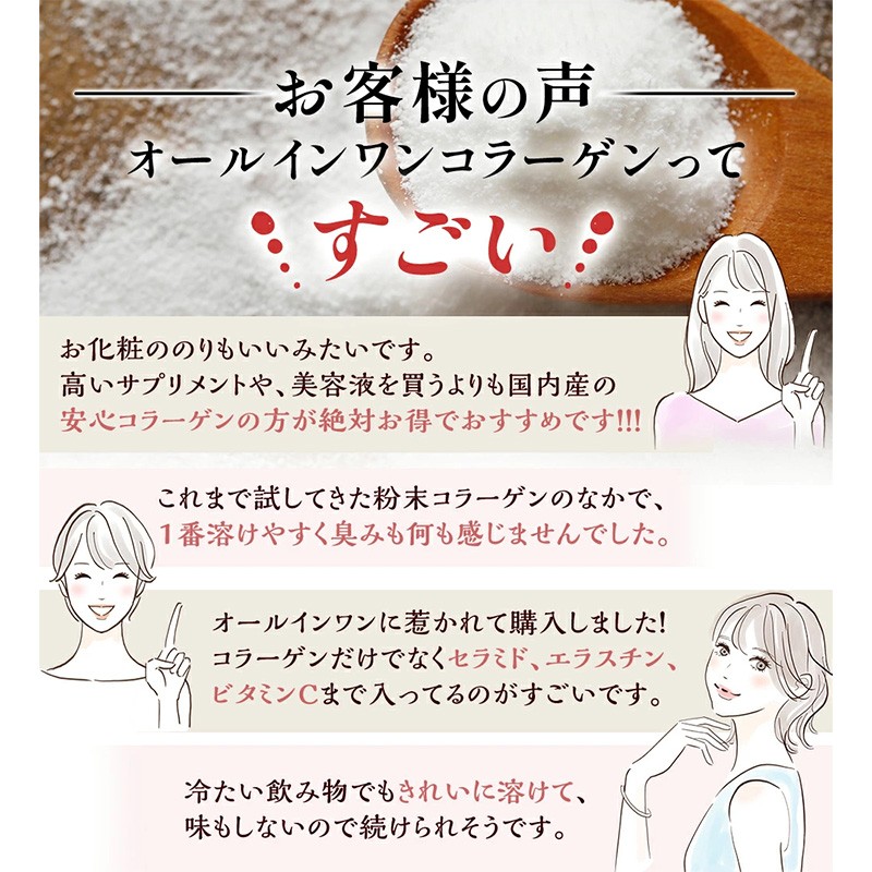 オールインワンコラーゲンは粉末タイプの美容サポートサプリメントです。毎日の「美」と「健康」をサポートするために、コラーゲン・エラスチン・セラミド・ビタミンCの4つの美肌成分をバランスよく配合しました。