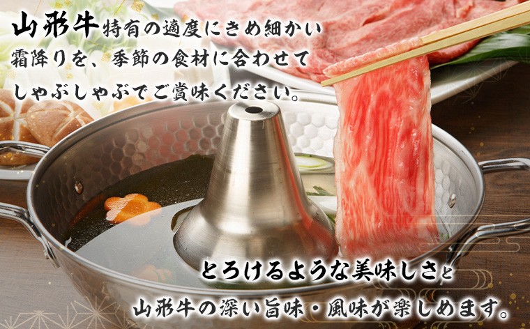 山形牛特有の適度にきめ細かい霜降りを、季節の食材に合わせてしゃぶしゃぶでご賞味ください。とろけるような美味しさと山形牛の深い旨味・風味が楽しめます。 山形連携中枢都市圏における共通返礼品です。関係市町(山形市、寒河江市、村山市、尾花沢市、山辺町、中山町、河北町、西川町、朝日町、大江町、大石田町、朝日町)で肥育された山形牛をお届けします。 事業者:株式会社中島商店 ◆必ずお読みください◆ ◎お受取り後は必ずすぐに開封し、中身のご確認をお願い致します。 ◎「お申し込みの不備」「事前連絡をいただいていない長期不在や転居」「住所不明」「日数が経ってからのお受取り」に対する再出荷は致しかねますのでご了承ください。 ※11月下旬~1月はご注文が多くなるため、お届けまでお時間を頂く場合がございます。 ※お礼の品の配送日の指定は承っておりません。 ※画像はイメージです。画像のものと多少異なる場合があります。 ※商品お受取り後、すぐに商品の状態をご確認ください。お礼の品の発送には万全を期しておりますが、万が一傷み等があった場合は、写真・画像を添付の上お早めに「山形市ふるさと納税お礼の品事務局」までご連絡ください。尚、お時間が過ぎてからの対応は致しかねます。
