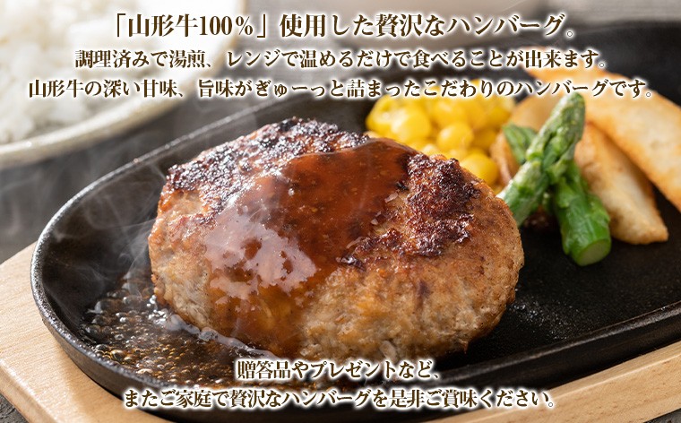 「山形牛100%」使用した贅沢なハンバーグ。 調理済みで湯煎、レンジで温めるだけで食べることが出来ます。 山形牛の深い甘味、旨味がぎゅーっと詰まったこだわりのハンバーグです。 贈答品やプレゼントなど、またご家庭で贅沢なハンバーグを是非ご賞味ください。 山形市内の工場において原材料の仕入れから、ひき肉へのミンチ加工、他の材料との練り合わせ、成形、焼き上げ、梱包まで行っている山形市の地場産品です。 事業者:株式会社中島商店 ◆必ずお読みください◆ ◎お受取り後は必ずすぐに開封し、中身のご確認をお願い致します。 ◎「お申し込みの不備」「事前連絡をいただいていない長期不在や転居」「住所不明」「日数が経ってからのお受取り」に対する再出荷は致しかねますのでご了承ください。 ※11月下旬~1月はご注文が多くなるため、お届けまでお時間を頂く場合がございます。 ※お礼の品の配送日の指定は承っておりません。 ※画像はイメージです。画像のものと多少異なる場合があります。 ※商品お受取り後、すぐに商品の状態をご確認ください。お礼の品の発送には万全を期しておりますが、万が一傷み等があった場合は、写真・画像を添付の上お早めに「山形市ふるさと納税お礼の品事務局」までご連絡ください。尚、お時間が過ぎてからの対応は致しかねます。