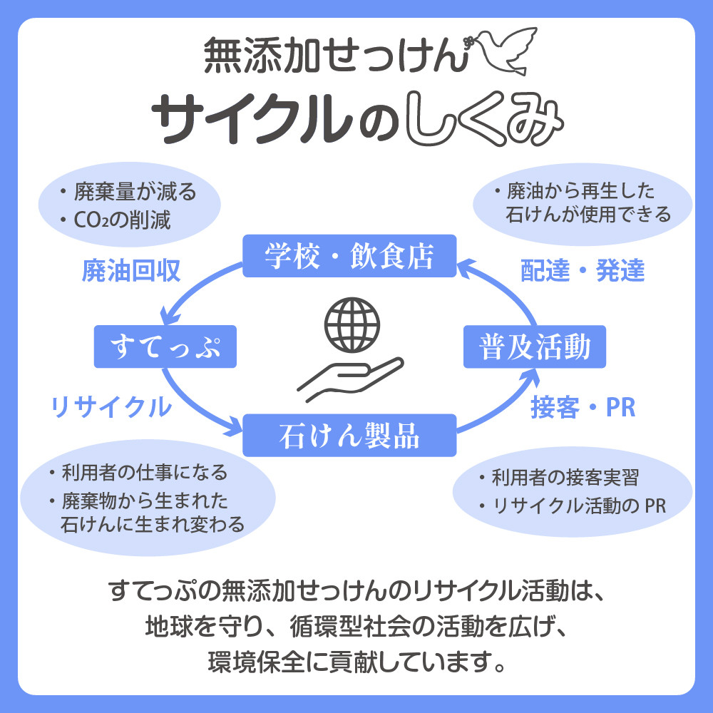全国リサイクルせっけん協会に入会し、せっけんの品質向上のため製造工程を見直し新たに「すてっぷの無添加せっけん」に生まれ変わりました。