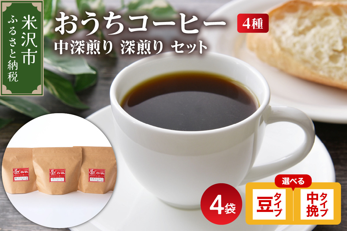 ダブル焙煎 家庭用 おうちコーヒー 中深煎り 深煎り 4種セット 1袋200g 800g 豆タイプ 中挽きタイプ コーヒー豆 山形県 米沢市